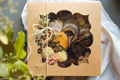 A cozy holiday box filled with artisanal cheeses, charcuterie, and seasonal fruits perfect for a smaller gathering.