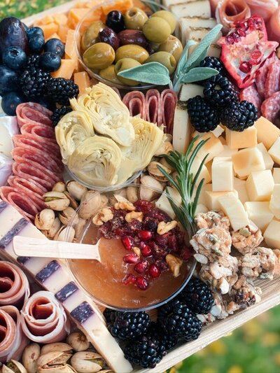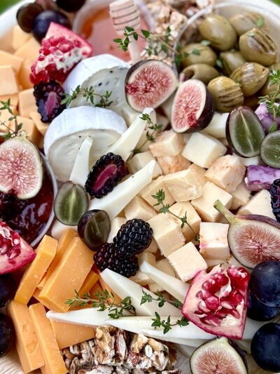 A beautifully styled board featuring a curated selection of cheeses, charcuterie, fruit, and spreads designed to share around the table.